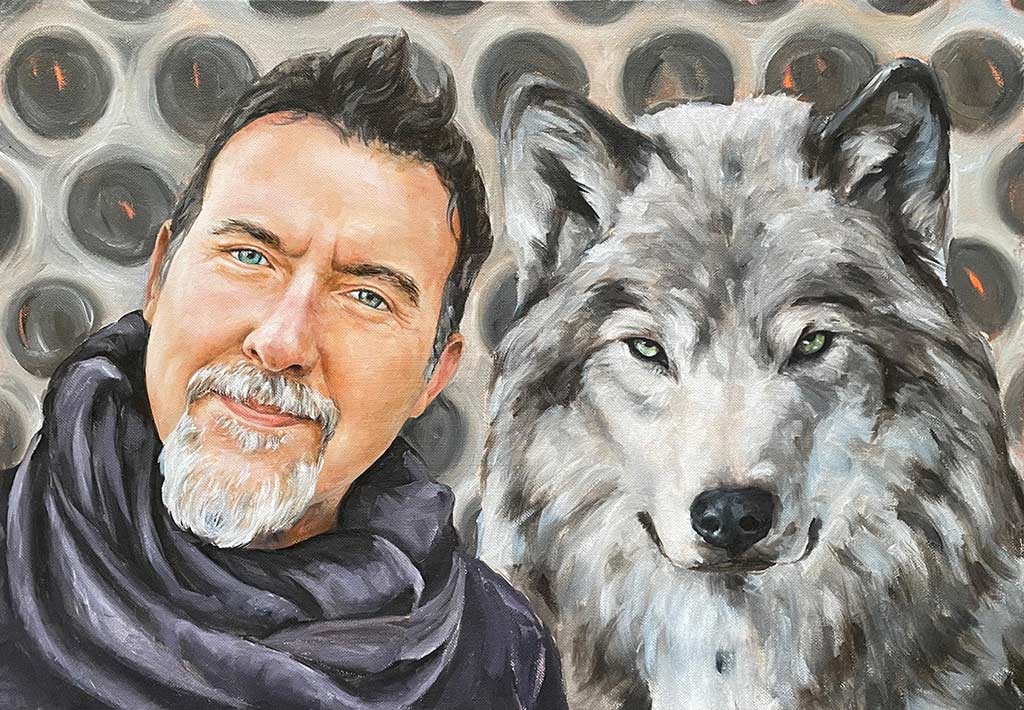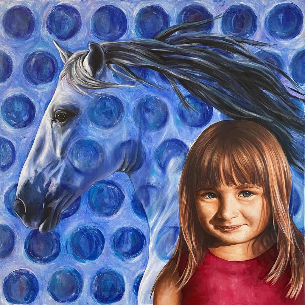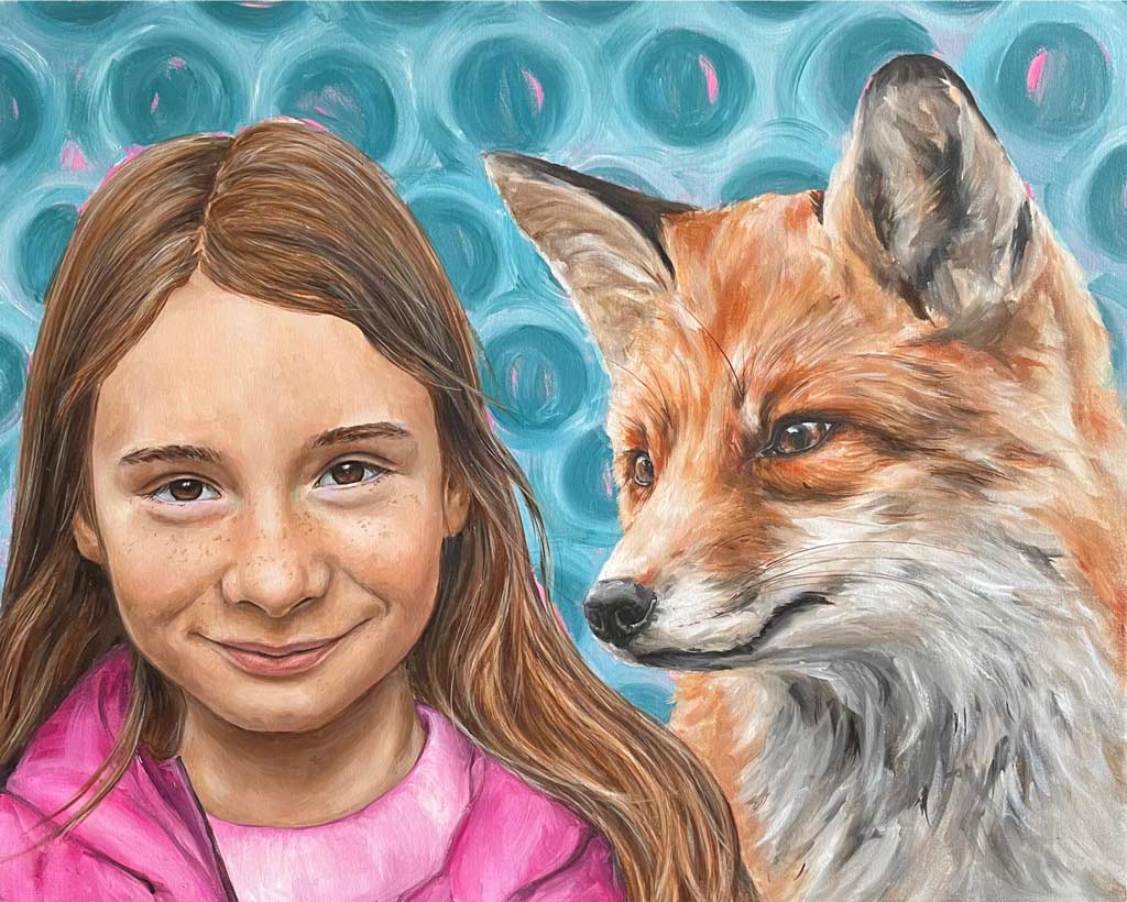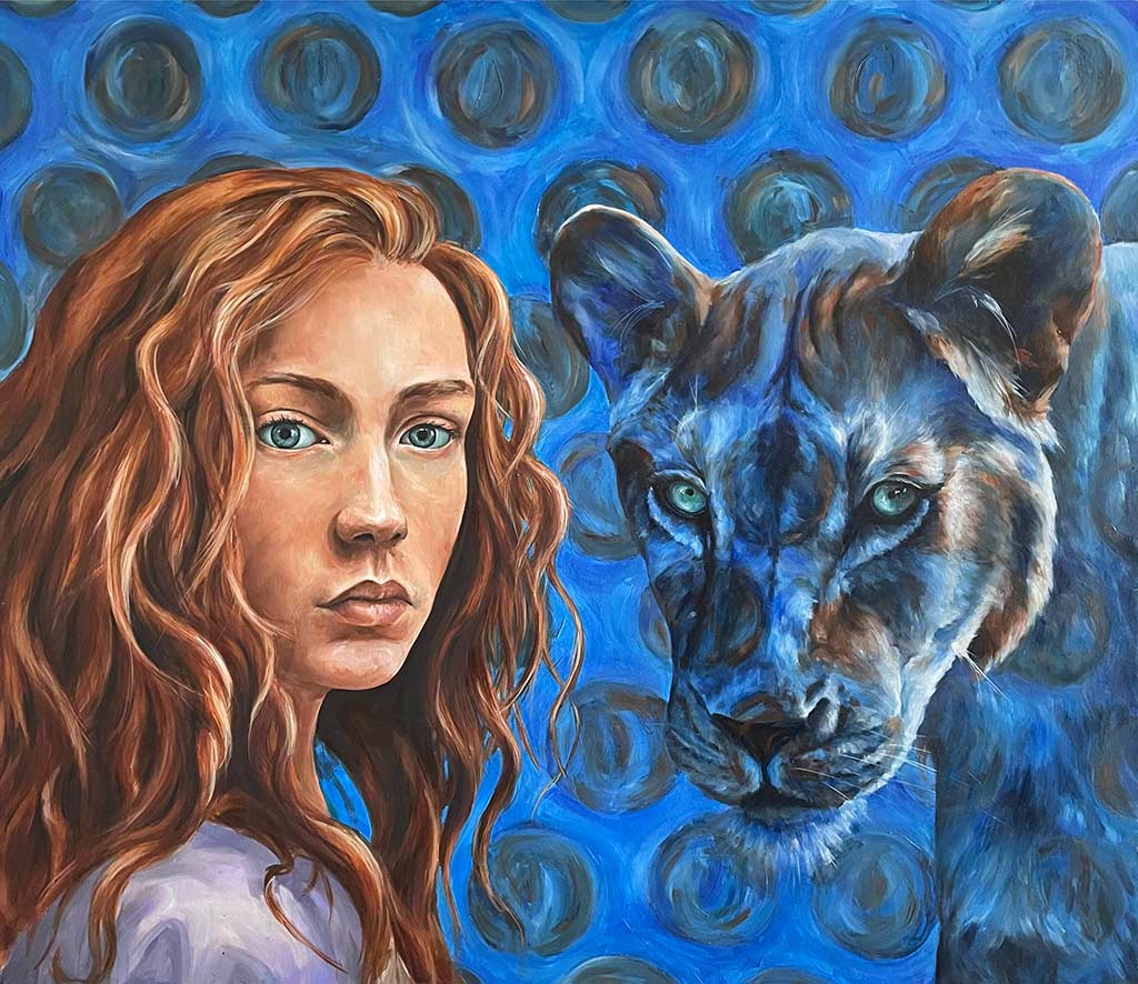 Nella serie Symbiosis l’artista ritrae una persona e ne interpreta l’animale guida, che diviene un animale simbiotico, un compagno interiore della propria vita, e può essere rivelato e scelto attraverso una profonda attrazione, un’emozione, un intimo richiamo, una sensazione di appartenenza. Con una visione contemporanea l’artista dipinge i due soggetti che si specchiano e dialogano in una fusione di anime, due mondi che divengono uno.